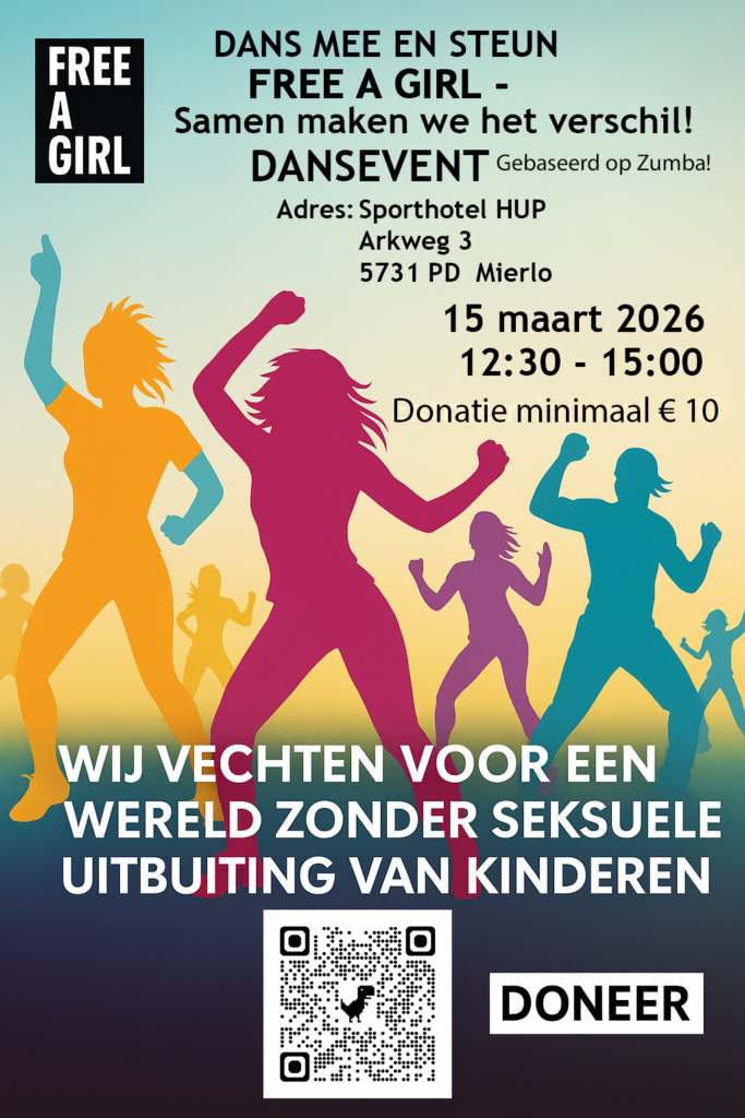 Op zondag 15 maart 2026 vindt bij Sporthotel De Hup in Mierlo een energiek Zumba-dansevent (gebaseerd op Zumba) plaats ten bate van Free a Girl. Met dit sportieve evenement willen de organisatoren geld inzamelen en aandacht vragen voor de strijd tegen seksuele uitbuiting van kinderen.